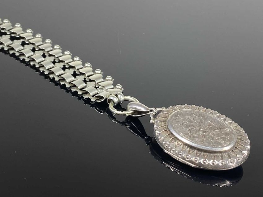 VICTORIAN SILVER HOLLOW BARREL LINK COLLARETTE, supporting a foliate engraved oval picture locket, chain 46cms (l), locket 4.5cms (l), gross weight approx. 42gProvenance: deceased estate Wrexham