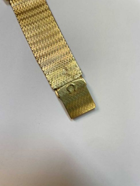 9CT OMEGA SEAMASTER DE VILLE BRACELET WATCH, c. 1965, champagne dial, faceted baton markers, centre seconds, integral 9ct gold mech link bracelet with textured deployant clasp, snap-on back, dial, case and clasp signed, 66.5gProvenance: private collection Vale of GlamorganComments: repair to bracelet near clasp, ticks when wound, crown adjusts as expected.Note: this item is available to view at our Cardiff Saleroom by appointment up until 5pm, Tuesday 2nd September, viewings in Chester thereafter.