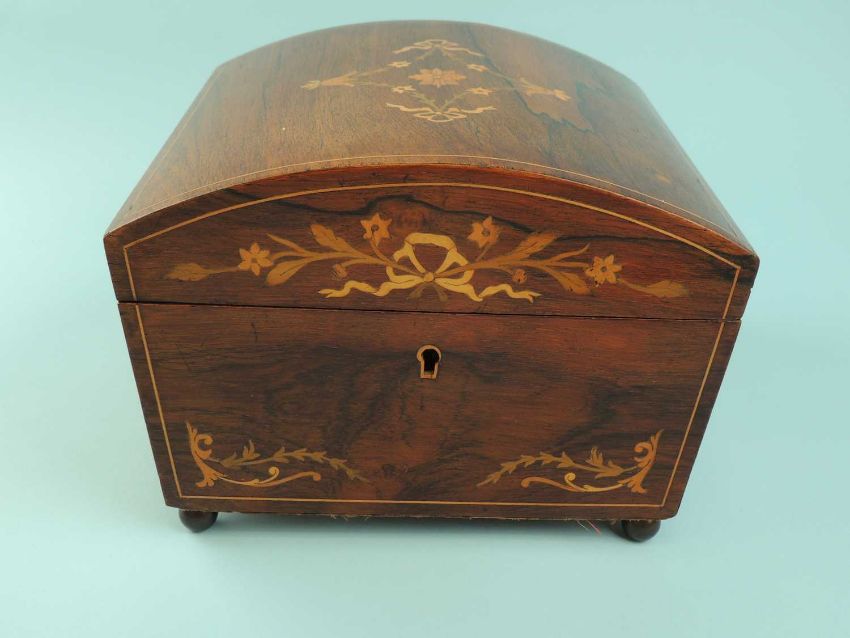 VICTORIAN INLAID ROSEWOOD DOME TOP TRINKET BOX, on gilded ball feet, 16 (h) x 22 (w) x 21cms (d)Provenance: private collection Cheshire