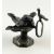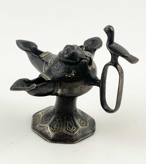 KHORASAN STYLE OIL LAMP with triple burners, cat form hinge cover, and loop handle surmounted with a bird, 13cms (h)Provenance: private collection Cheshire