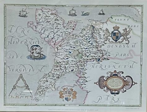 JOHN SPEEDE, Anno Domini 1610, hand coloured engraved map 'Caermarden both Shyre and Towne described (sic)', double-sided, 39cm x 52cm; also a BRITISH MUSEUM MAP of SAXTON'S MAP OF CAERNARVONSHIRE AND ANGLESEY, circa 1578, printed 1963, 38cm x 51.5cm. Comments: both framed and glazedProvenance: private collection Gwynedd