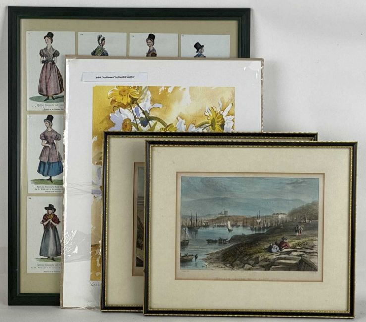 ‡ VARIOUS ARTISTS including DAVID GROSVENOR (b. 1956) limited edition (19/200) colour print - sunflowers, 45.5 x 36cms; J. C. NAPPER hand engraved colour print - 'The Menai Bridge', 20 x 27cms; HANHART colour lithograph - Penrhyn Castle from Garth Point, 19 x 26cms; LADY LLANOVER twelve colour plates - Welsh girls in Cambrian costumes, 50 x 40cms overallProvenance: private collection GwyneddComments: Grosvenor unframed, others framed and glazed