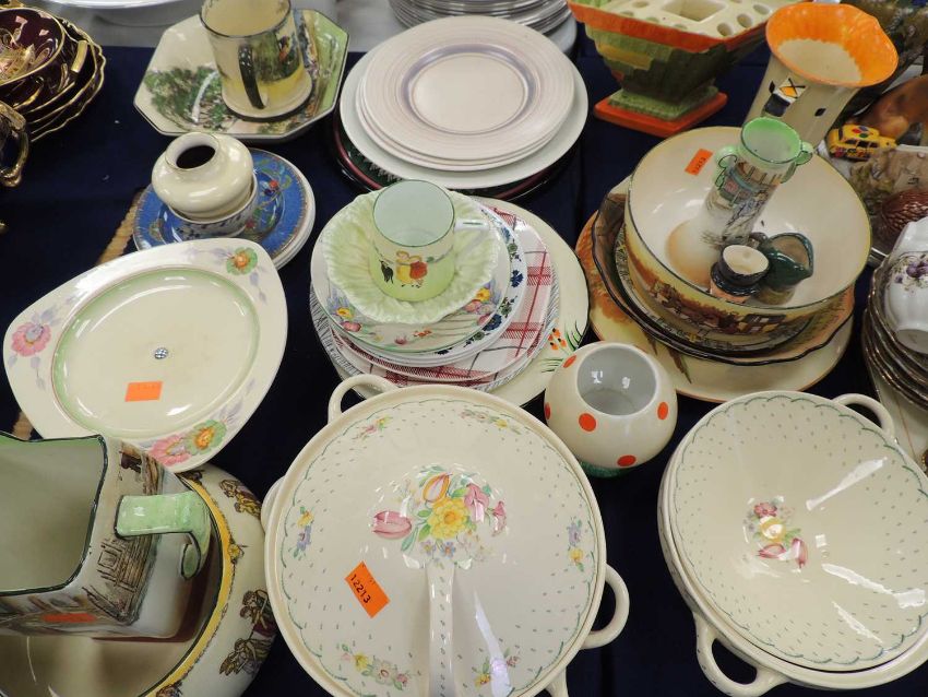 SHELLEY MUSHROOM FORM SUGAR BASIN designed by Mabel Lucie Attwell, along with assorted Susie Cooper tureens, Royal Doulton series ware, Quimper plaque, Art Deco flower vase jug, etc.Provenance: private collection MerseysideComments: Shelley sugar basin cracked