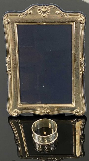 MODERN SILVER FACED PHOTOGRAPH FRAME, 20 x 14.5cms, and circular silver napkin ring with engraved decorationProvenance: deceased estate Conwy