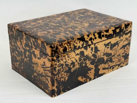 JAPANESE TORTOISESHELL EFFECT TRINKET BOX with gilded decoration, hinged cover with mirrored underside, containing lift-out tray with lidded compartments, drawer to base, metal escutcheon and handle, 14 (h) x 30 (w) x 21cms (d)Provenance: private collection Conwy