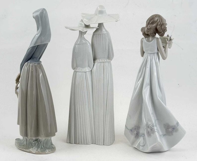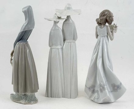 LLADRÓ FIGURINE OF TWO NUNS, no. 4611, 34cms (h); lady with basket of fruit, 34cms (h); young lady with basket of butterflies, no. 6777, 34cms (h); and a Lladró shell form collector's stand, 11 x 15cmsProvenance: private collection Cheshire
