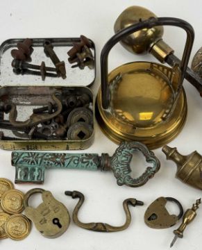 ASSORTED COLLECTABLES, 19th century and later, including a brass pocket watch stand, 16cms (h); brass hand bell cast with oak leaves and acorns, turned handle, 13cms (h); pair of brass doorknobs and one other, etc.Provenance: private collection Wrexham