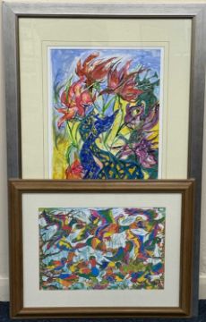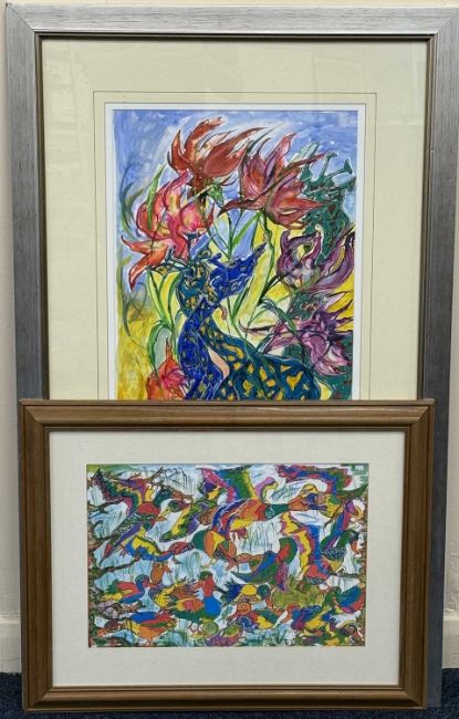 JENNIFER MARY DODD (British contemporary) two works, watercolour/mixed media - entitled verso 'Giraffes, Entwined, Embraced' on artist's labels, signed lower right, 74 x 35cms; and colour print - entitled verso 'Funky Ducks', 28 x 41.5cms (2)Provenance: private collection Wrexham