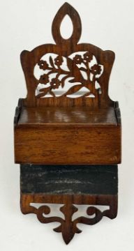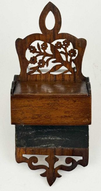 18TH CENTURY OAK TABLE SNUFFBOX / SPILL BOX, bow front design, hinged cover with wire hinges, 4 (h) x 16.5 (w) x 7cms (d); together with a 19th century walnut match holder modelled on a candle box, fret pierced carving above compartment with sloping hinged cover, match striker beneath, 18 (h) x 7.5 (w) x 4.5cms (d) (2)Provenance: private collection Wrexham