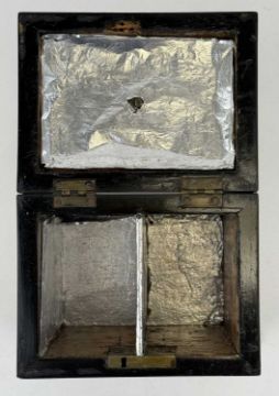 GEORGE III RECTANGULAR TEA CADDY, hinged cover with oval inlaid fan medallion and brass knob, front inlaid with oval monogram medallion and with ivory escutcheon, on our cast brass paw feet, 13 (h) x 13.5 (w) x 10cms (d)Provenance: private collection WrexhamGOV.UK Ivory content- to comply with current regulation - self-declaration form completed for the sale of this item - Submission reference KSB5DPU5