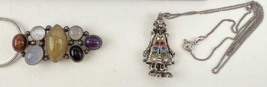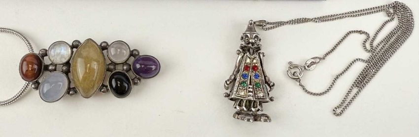 GOOD ASSORTMENT OF SILVER / WHITE METAL JEWELLERY, including stone-set articulated clown pendant with chain; articulated fish pendant with chain; Elizabeth II ingot with chain; Siamese items including bracelet, necklace, and two brooches; Tiffany & Co. Elstree Film & Television Studios bookmark with cloth bag and box, dragon pendant; two Rennie Mackintosh Collection pendants and chains; amber pendant and pair of similar earrings, etc.Provenance: private collection Cheshire