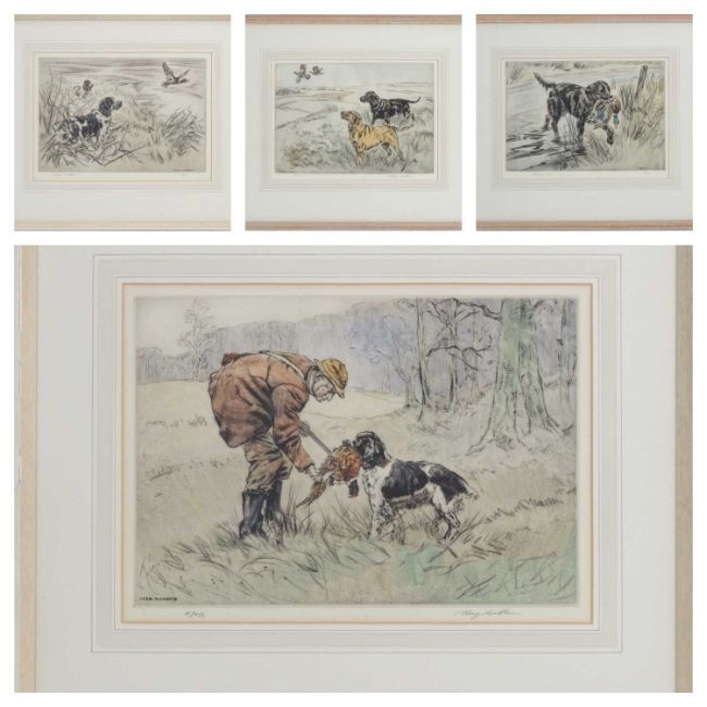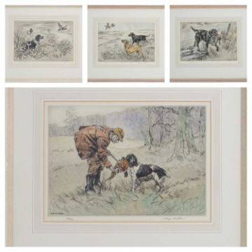 HENRY WILKINSON (1920-2011), Four signed limited edition hand coloured drypoint etchings 'Flushing quarry', 'Quarry retrieved', 'Flushed grey partridge' and 'Retrieved quarry', numbered 32/75, 75/75, 39/75 and 18/750 respectively, 28cm x 39cm (4)Provenance: private collection Wirral