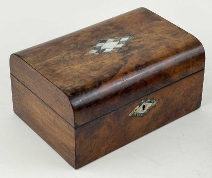 TWO 19TH CENTURY TRINKET BOXES, walnut, hinged cover inlaid with mother of pearl tablet, fitted interior with lift-out tray, 13 (h) x 25 (w) x 17cms (d); and rosewood with mother of pearl stringing and roundels, 10 (h) x 25 (w) x 17cms (d)Provenance: private collection Wrexham