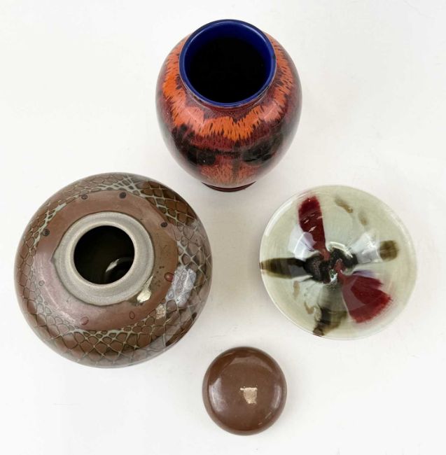 POOLE DELPHIS RED GROUND VASE, 21cms (h); together with a studio pottery ginger jar, 16.5cms (h); and a similar decorated bowl, 15cms (h) (3)Provenance: private collection Chester