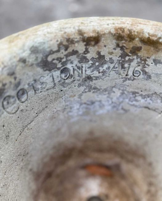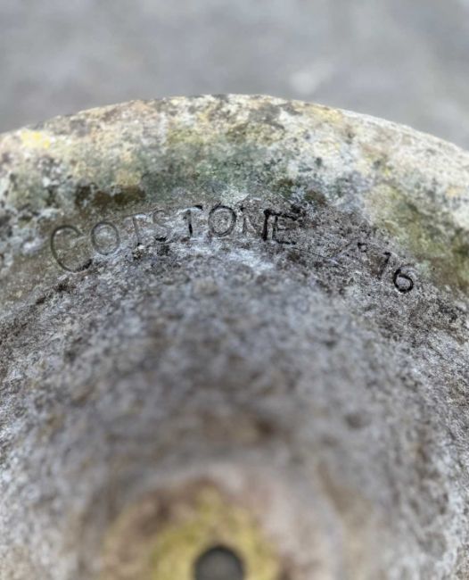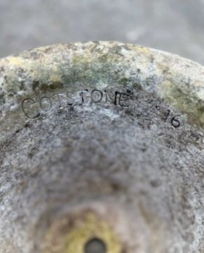 THREE COTSTONE ROUND PLANTERS, stamped A16, 30 (h) x 35cms (dia.) plus one similarly patterned but without signature, 34 (h) x 39cms (dia.) (4)Provenance: private collection CardiffComments: usual weathered condition, no significant damage