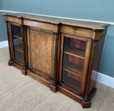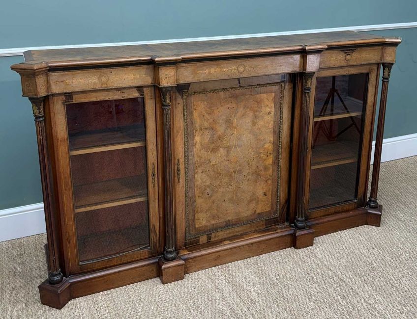 LATE VICTORIAN BURR WALNUT MARQUETRY SIDE CABINET, glazed doors flanking central panel door, gilt metal borders and stop fluted outset columns (formerly a parlour cabinet, top missing), 101 (h) x 180 (w) x 40cms (d)Provenance: private collection Vale of GlamorganComments: central door loose, general scratches & veneer lift, inspection advised
