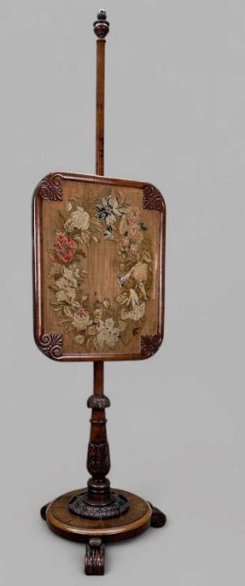 EARLY VICTORIAN ROSEWOOD POLE SCREEN, adjustable needlepoint panel on leaf carved column and base, platform and scrolled feet, acorn finial, 145cms (h)Provenance: private collection Vale of Glamorgan