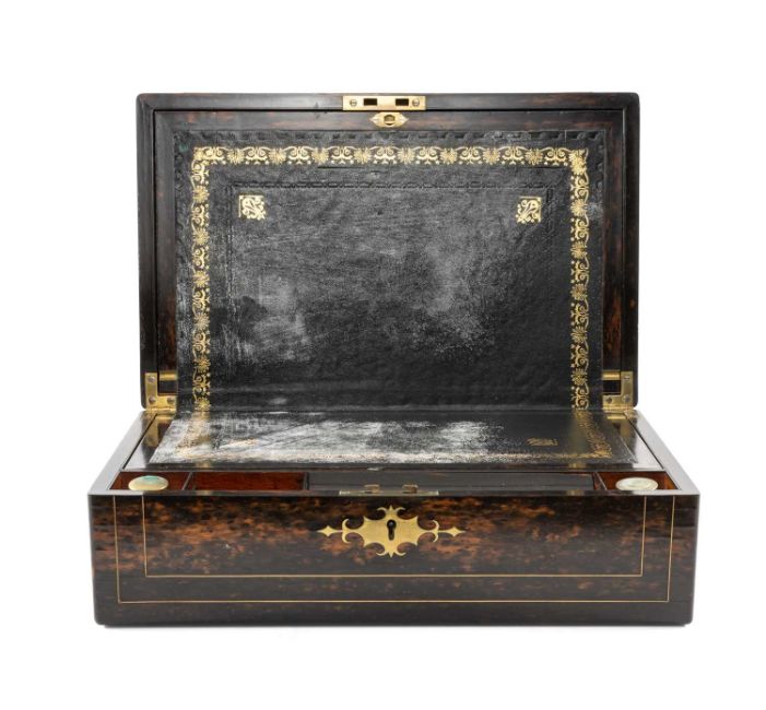 EARLY 19TH CENTURY BRASS INLAID CALAMANDER WRITING SLOPE, strung and inlaid with shaped escutcheons, interior with ink bottles and laid with later baize, sides with flush gilt brass handles, 13.3 (h) x 40.3 (w) x 25.2cms (d)Provenance: private collection NewportComments: age cracks only, lock may need some attention, otherwise very good