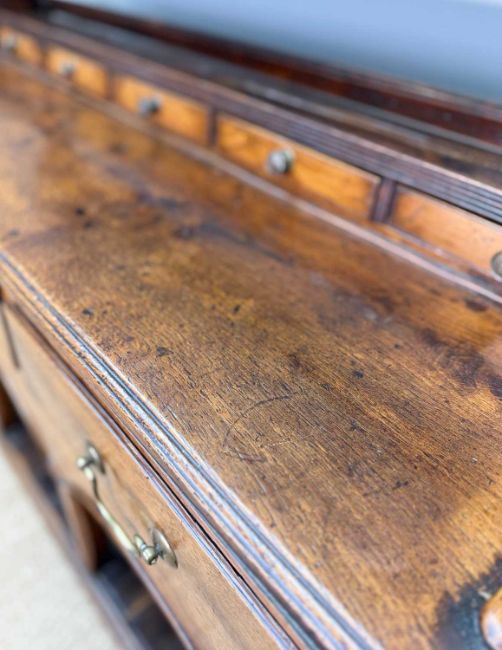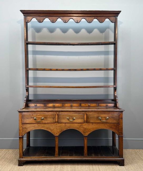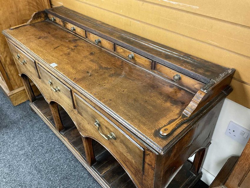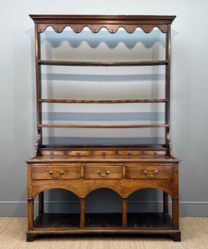 GEORGE III OAK WELSH DRESSER, open rack, above base fitted with five spice drawers, three frieze drawers, triple arches, canted square section columns and pot-board base, 208 (h) x 142 (w) x 46cms (d)Provenance: deceased estate CardiffComments: minor old worm, some staining, frieze with split, generally good, inspection advised