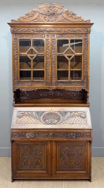 20TH C. FLEMISH STYLE CARVED OAK BUREAU BOOKCASE, fitted interior, tooled leather writing insert, two frieze drawers, cupboards below, 252 (h) x 117 (w) x 52cms (d)Provenance: private collection CoventryComments: drop-flap with split near hinge, minor moulding loss (upper section support), otherwise good, inspection advised