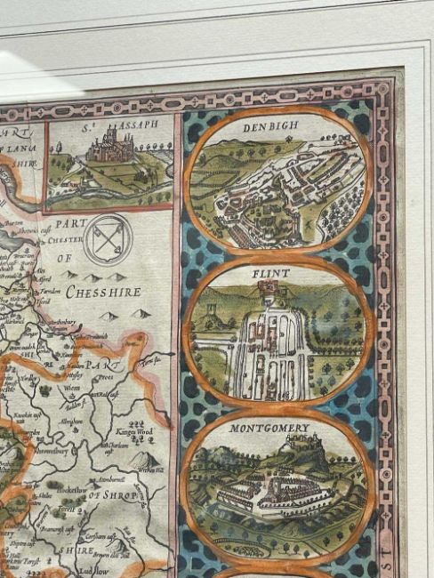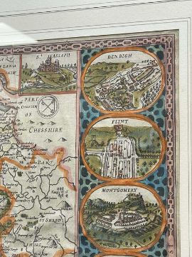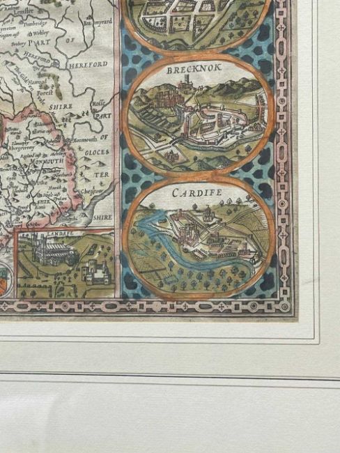 JOHN SPEED, hand-coloured double-page printed map of Wales, with town vignettes in the border from Beaumaris to Cardiff, lower cartouche inscribed ‘Sold by Roger Rea the Elder & Younger at Ye Golden Cross in Corn Hill against the Exchange’, 38 x 50.5cmsProvenance: private collection Cardiff