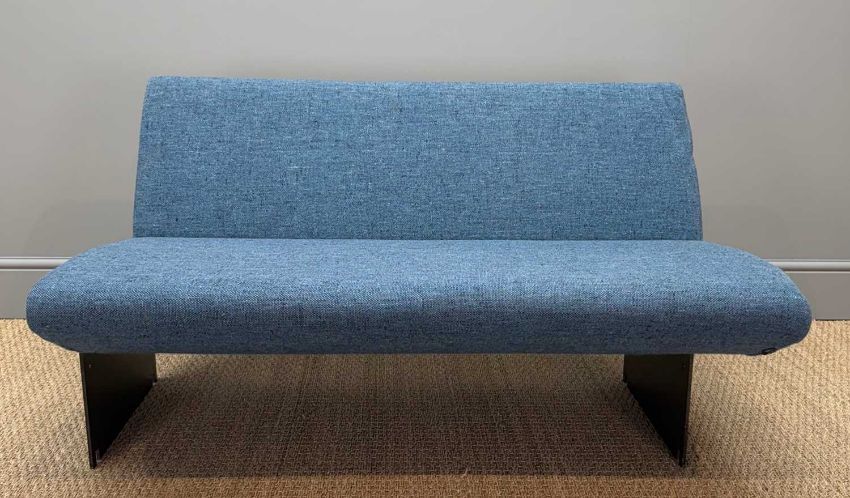 LARGE CONTEMPORARY ITALIAN TWO-PIECE SOFA BY MOROSO , flecked blue wool upholstery, raised on steel 'blades', possibly constructed for commercial use, 68 (h) x 178 & 119 (w) x 78cms (d)Provenance: consigned via CardiffComments: moth damage to upholstery, storage indents, light stains, inspection advised