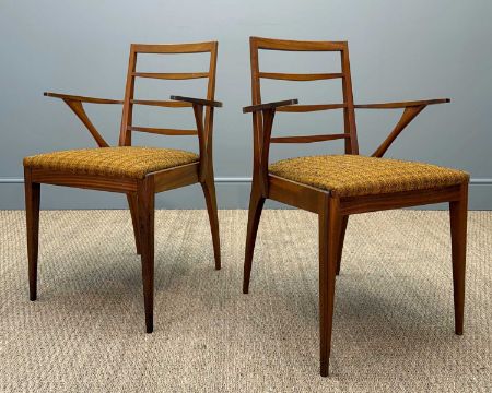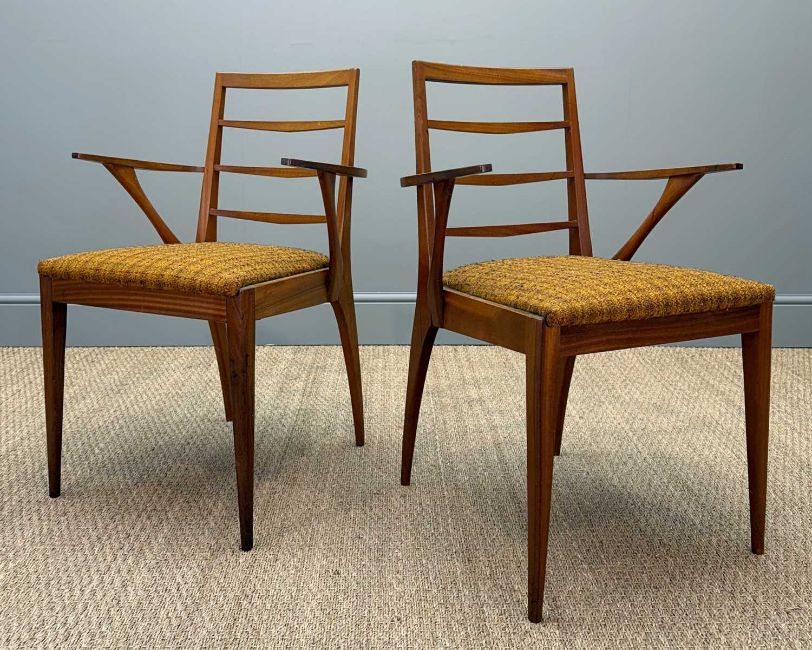MID-CENTURY TOM ROBERTSON FOR McINTOSH TEAK EXTENDING TABLE & CHAIRS, Dunvegan rectangular table with single butterfly extension together with two 9074 ladderback carvers and three 9073 dining chairs, orange/mustard plaid cloth seat upholstery, 74 (h) x 147 (w) (plus 46cms extension) x 83cms (d) (6)Provenance: private collection CoventryComments: table top with small streaks of (decorators) paint, extension with light scratch, chairs solid, generally good, inspection advised