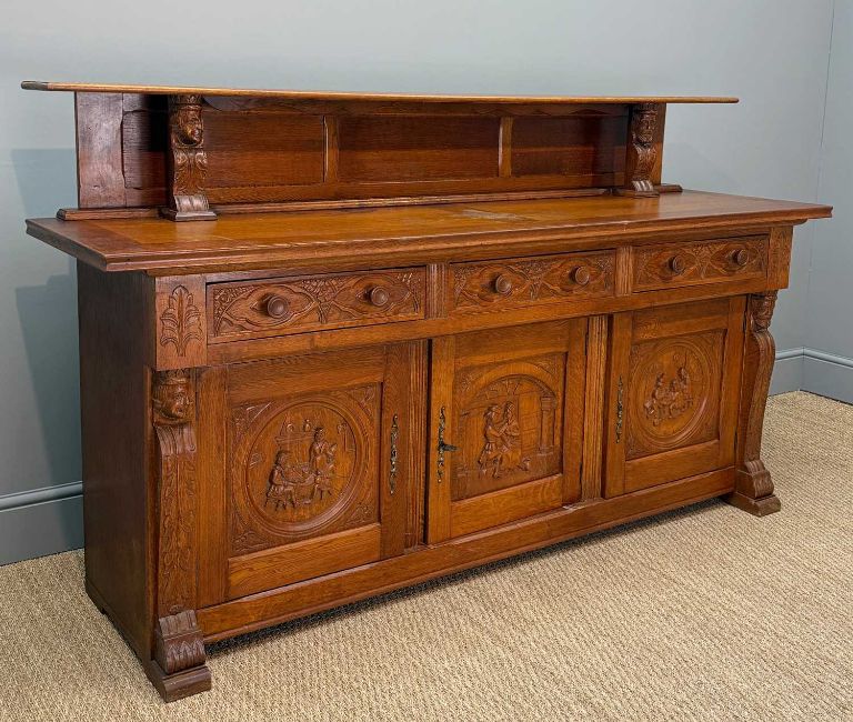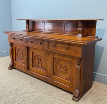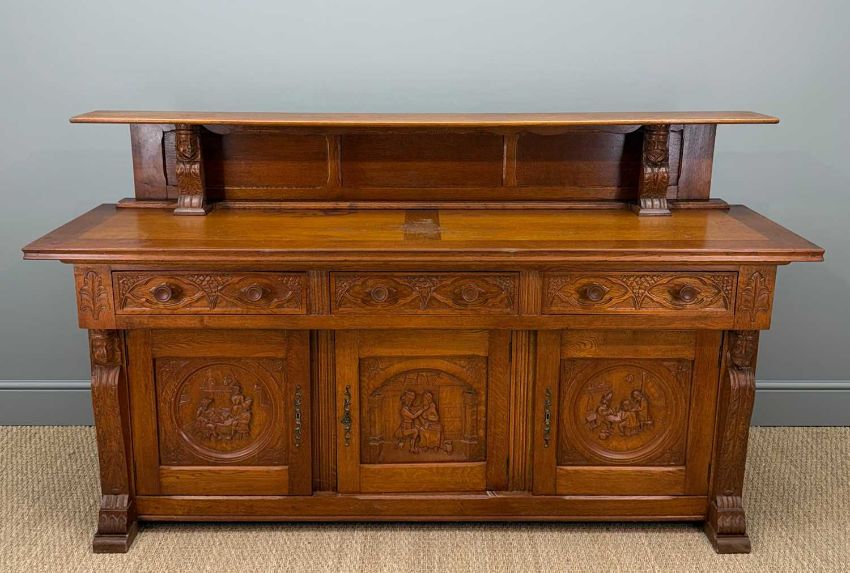 FRENCH HENRY II STYLE CARVED OAK BUFFET, c. 1920, three frieze drawers above conforming cupboards carved with tavern scens, caryatid uprights, 117 (h) x 200 (w) x 58cms (d)Provenance: private collection CardiffComments: general stains and wear, inspection advised