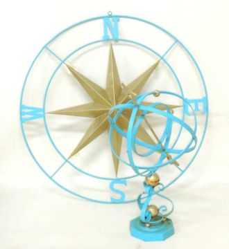 DECORATIVE PRESSED & PAINTED METAL WALL COMPASS, 105cms (diam.); together with a painted metal armillary sphere, 83cms (h) (2)Provenance: The collection of Philip Clarkson