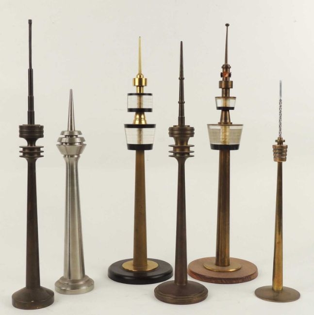 COLLECTION OF CONTINENTAL TELEVISION TOWER MODELS, circa. 1950 - 1970, 35cms (h) the tallest, most constructed of metal, the larger two with wooden bases (6)Provenance: The collection of Philip Clarkson