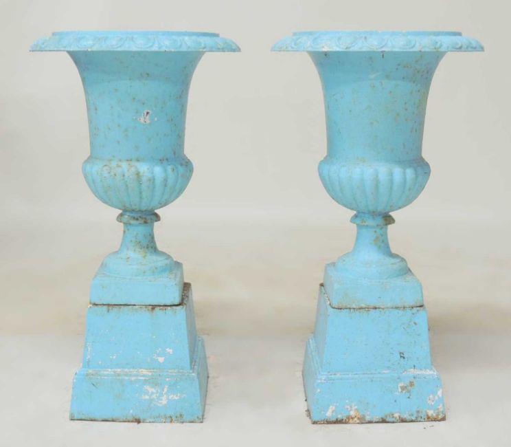 PAIR OF PAINTED CAST IRON GARDEN PEDESTAL URNS, with egg and dart collar, tapered stepped square plinth, 88 (h) x 47cms (diam.)Provenance: The collection of Philip Clarkson