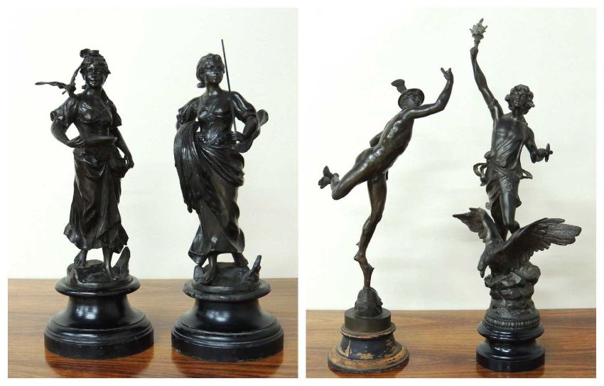 PAIR OF FRENCH BRONZED SPELTER FIGURES, c. 1900, mounted on ebonised wooden socles, 46cms (h); together with a further French spelter figure of Mercury, 69cms (h); and another of Liberty, 71cms (h) (4)Provenance: The collection of Philip Clarkson
