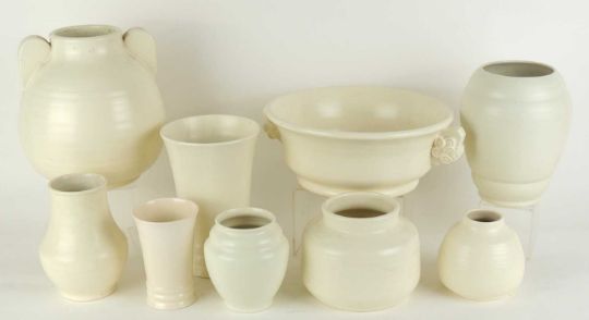 POOLE MAGNOLIA WHITE VASES, in traditional 1930s shapes, including 668, 21cms (h); flared vase (983), 19.5cms (h); and a shallow bowl (672), 25.5cms (diam.) (9)Provenance: The collection of Philip Clarkson