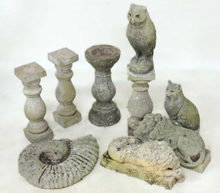 PAIR OF RECONSTITUTED STONE LIONS, 43cms (h); reconstituted stone ammonite, 45cms (h); owl, 40cms (h); three baluster pedestals, each 41-46cms (h); baluster bird bath, 46cms (h); and a cat, 34cms (h) (8)Provenance: The collection of Philip Clarkson