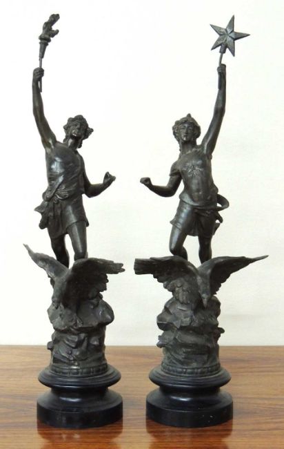 PAIR OF FRENCH SPELTER FIGURES 'NIGHT' & 'DAY', on turned wooden bases, 51cms (h)Provenance: The collection of Philip Clarkson