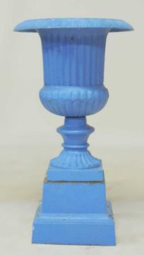 LARGE PAINTED CAST IRON PEDESTAL GARDEN URN, campagna form, over a tapered and stepped square plinth, 100 (h) x 54cms (diam.)Provenance: The collection of Philip Clarkson