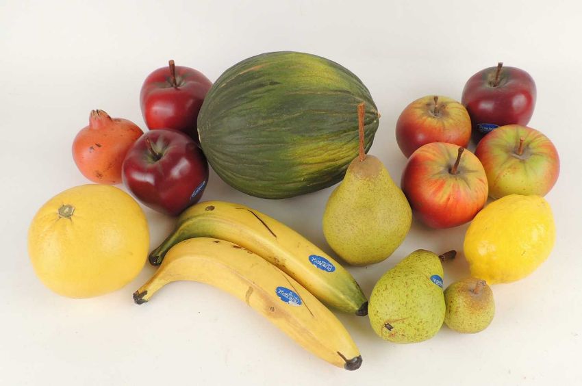PENKRIDGE POTTERY REALISTIC FRUITS, comprising green melon, apples, pomegranate, lemon, grapefruit, pears, and bananas (15)Provenance: The collection of Philip Clarkson