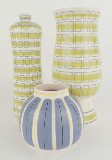 POOLE POTTERY CONTEMPORARY FOOTED VASE, PJL (704), 27.5cms (h); together with PJL (707), 27.5cms (h); and YAS (185), 12cms (h) (3)Provenance: The collection of Philip Clarkson