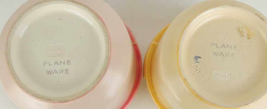 POOLE PLANE WARE ART DECO VASE (861P), finished in straw with yellow trim, 12.5cms (h); together with a similar vase, finished in pastel pink (2)Provenance: The collection of Philip ClarksonComments: pastel pink vase with hair crack to the rim