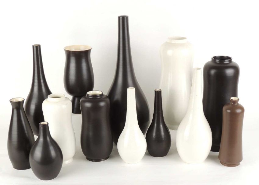 COLLECTION OF POOLE POTTERY VASES, in black panther and magnolia white glazes, being generally bottle vases and marrow shaped vases, tallest (698) 39.5cms (h) and tallest marrow vase 27.5cms (h), smallest being a bottle vase, 15.5cms (h); and one chocolate glazed waisted vase, 19cms (h) (13)Provenance: The collection of Philip Clarkson