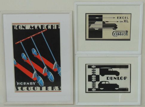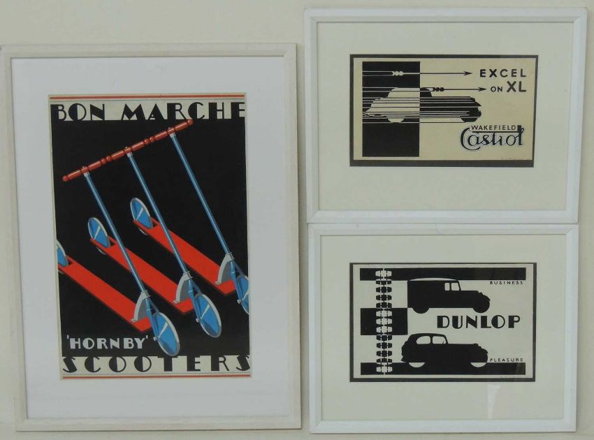 GLADYS WILLIAMSON (1914-2007), ORIGINAL PROTOTYPE DESIGN FOR AN ADVERTISEMENT FOR HORNBY 'SCOOTERS',, signed in pencil lower right, 46 x 31cms; together with a monochrome design for Dunlop, and another for Castrol, each signed and dated 1935, 18 x 29cms (3)Provenance: The collection of Philip Clarkson