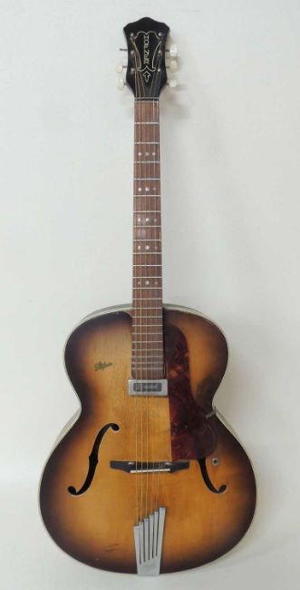 HÖFNER SENATOR ELECTRIC SEMI-ACOUSTIC ARCHTOP GUITAR, c. late 1950s, no. 7649, 106cms (l); with a modern guitar stand (2)Provenance: The collection of Philip ClarksonComments: guitar with one tuning head deficient