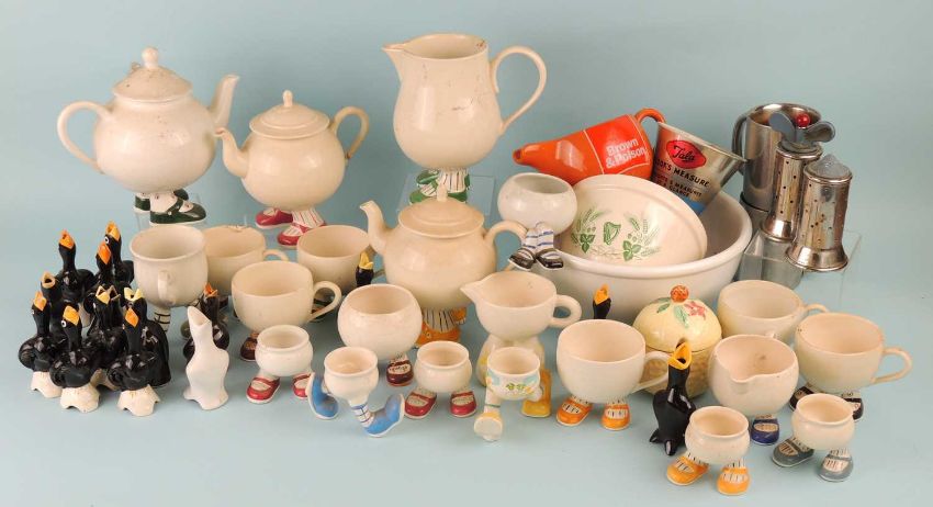 COLLECTION OF NOVELTY POTTERY FOOTED TEAPOTS, CUPS & JUGS, including Carlton Ware egg cups, a number of blackbird pie funnels including Newport Pottery, and other kitchenalia (qty)Provenance: The collection of Philip Clarkson