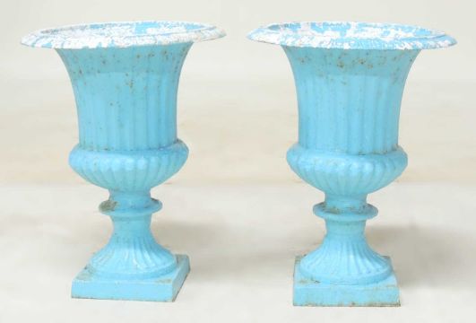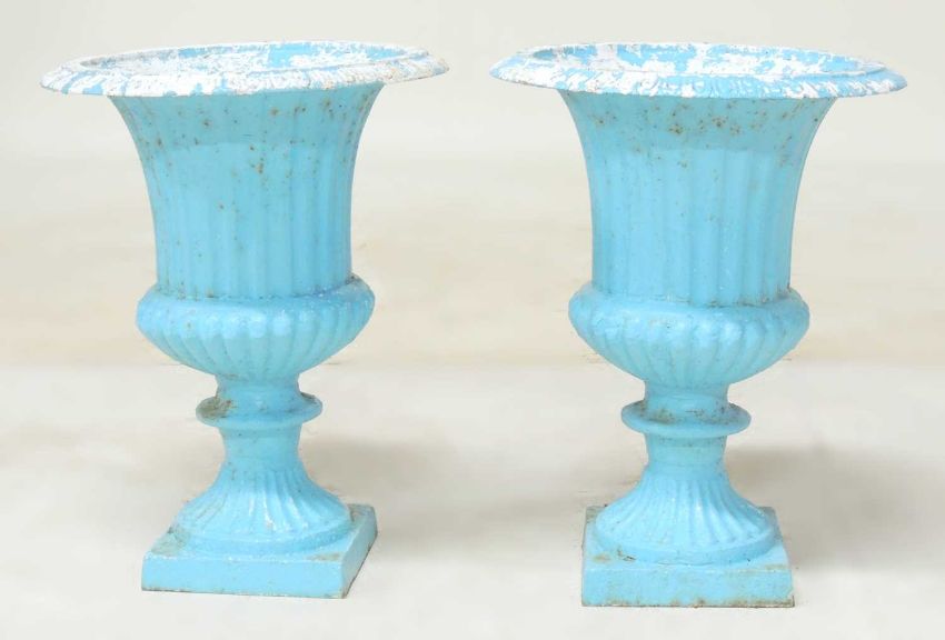 PAIR OF CAST IRON CAMPAGNA GARDEN URNS, with egg and dart collar, raised on square base, 48 (h) x 35cms (diam.)Provenance: The collection of Philip Clarkson