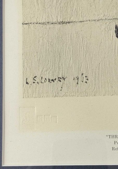‡ LAURENCE STEPHEN LOWRY, RBA RA (British, 1887-1976) limited edition offset colour lithograph - Three Men and a Cat, indistinctly signed, with the blindstamp for the Fine Art Trade Guild no. 299/850 as indicated on Park Gallery label verso, 27.5 x 18cmsProvenance: private collection CardiffComments: slight time staining to the paper, slightly muted colours, biro signature has faded but impression is visible, not examined out of the frame.