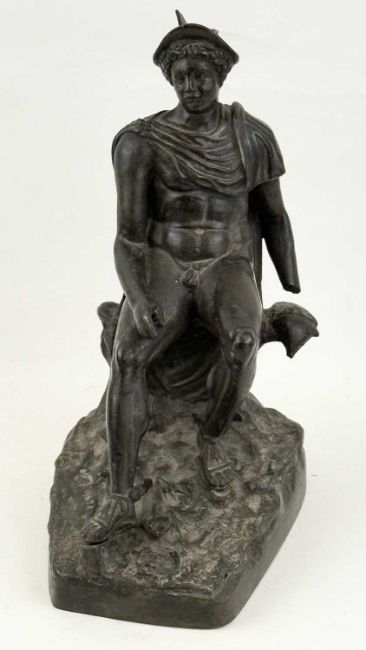 19TH CENTURY CAST BRONZE FIGURE OF MERCURY, seated with a lizard at his feet, 30cms (h)Provenance: private collection Chester