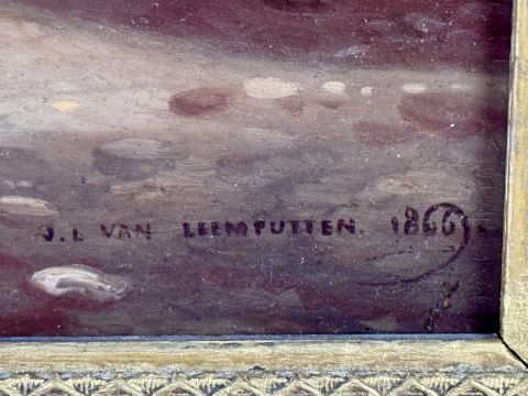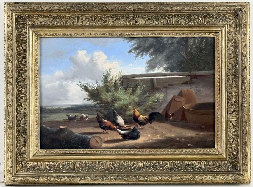 JEF LOUIS VAN LEEMPUTTEN (Belgian, 1867-1948) oil on panel - hens and rooster in yard, signed and dated 1866 lower right, 22 x 34.5cmsProvenance: private collection CheshireComments: framed