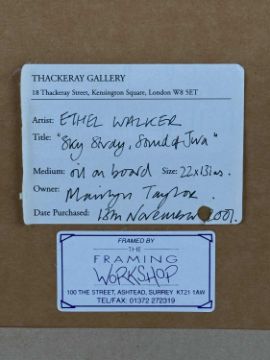 ‡ ETHEL WALKER (Scottish b.1941) oil on board - 'Sky Study, Sound of Jura', entitled verso on Thackeray Gallery label, signed lower right, 53 x 31cmsProvenance: private collection MerseysideComments: framed and glazed