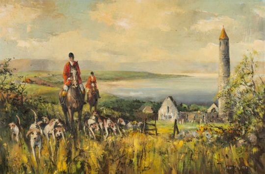 ‡ ANNE TALLENTIRE (b. 1949) oil on canvas - Huntsman and hounds in Ardmore, County Waterford, Ireland, signed, 59.5 x 90cmsProvenance: private collection Vale of Glamorgan