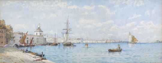 GEORGE STANFIELD WALTERS RBA (British, 1838-1924) watercolours (a pair) - two landscape views of Venice entitled, 'Dogana Di Mare' and 'Pellestrina' both signed, both 23 x 57cmsProvenance: private collection MonmouthshireComments: both similar original frames, both slightly faded, some paper browning